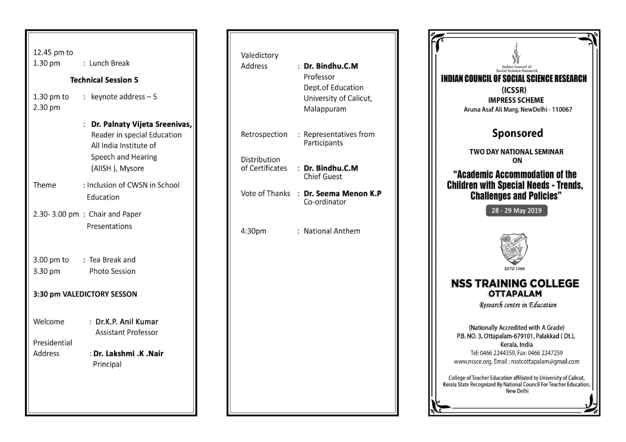 First day of the ICSSR sponsored national seminar on " Academic accommodation of Children with special needs" at NSS Training College, Ottapalam.. There were more than 60 registration from trs/ research scholars/ M. Ed Students and then inmates too.. Dr. Lakshmi K Nair, Principal of the college who is retiring from the service was honoured by the seminar organisers.. The seminar was enriched by the sessions if Dr. Vaibhav Jadav, Dr. Aerum Khan, other invited lectures and paper presentations in parallel sessions..